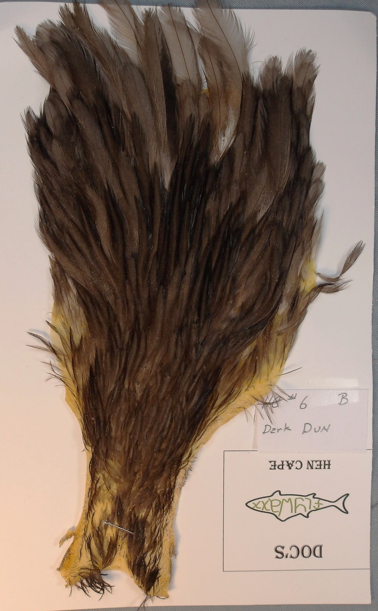 Doc's Hen Cape : This is nice Dark Dun but slightly smaller with a lower feather count but still will tie a bunch of flies for the money.